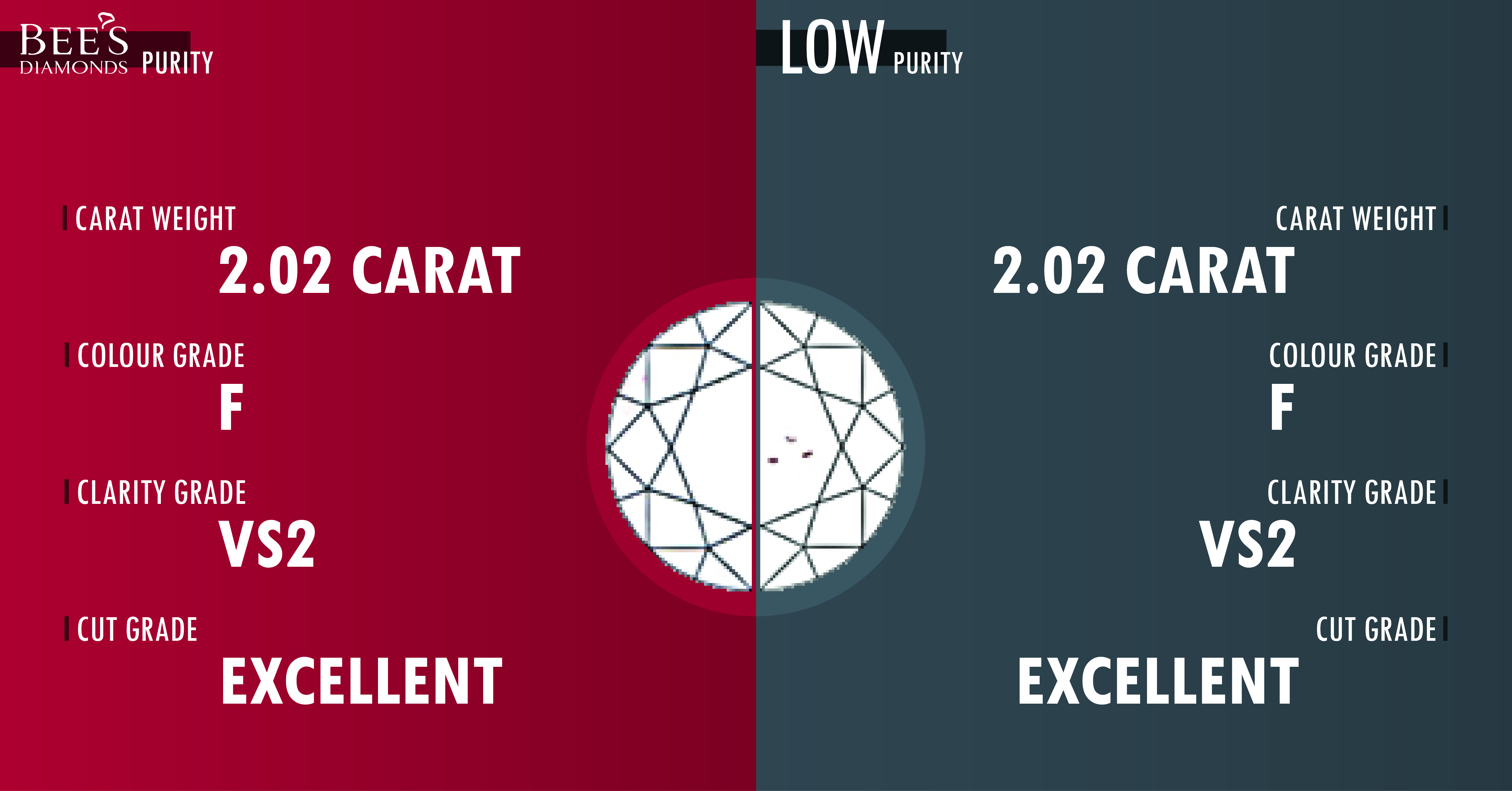 因為淨度的評級只是以在10倍放大鏡觀察下, 以鑽石內含物的多少去劃分。而事實上, 除了內含物的數量外, 大小、位置、顏色等也會影響到鑽石的價錢。比方說, 同等淨度的鑽石中, 如果內含物分佈在偏正中間的位置, 會對鑽石的外觀影響較大, 價錢自然就會低一點; 如果內含物出現在側面的位置, 很自然會對外觀影響較少, 那麼價錢也會稍為高一點。